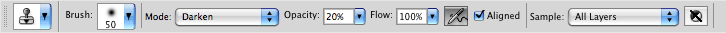 Step 1: In the example here, a layer base of color must first be applied to the hotspot before adding texture back into the blown out portions of the image. Without a good base of color that matches the surrounding areas, your final edits won’t look credible. To do that, select the Clone Stamp tool (S) from the toolbox and choose a soft-edged brush from the Brush Preset picker. In the Options bar change the Effect Mode to Darken, and lower the Brush Opacity to around 20%. These settings properly set the clone stamp up to help make your corrections look realistic. (Figure 3)