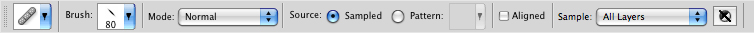 Step 2: To create texture for your colored-in area, use the Healing Brush. In the Options bar leave the Mode set to Normal and the Source set to Sampled. (Figure 4) Like the Clone tool, work with a soft-edged brush and use it to sample desired areas of texture just outside the hotspot zone. Hold down the Option key (PC: Alt key), click once to sample some pixels and move your cursor to the area you want to edit. Begin painting by clicking with the mouse. You can also click and drag the cursor to create small short strokes. This action adds texture to your previous work and helps make your corrections look as organic as possible.